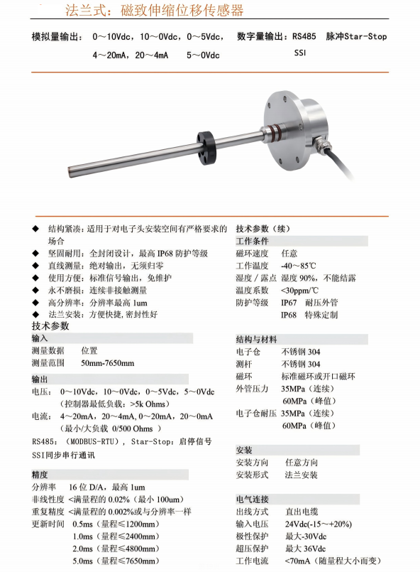 GBF-F产品电子头采用全密封式设计,法兰式安装,具有结构紧凑,抗干扰能力强,全密封抗污、防油、防水(汽)等特殊优点;拟量输出包括:直流电流4~20mA(正、反向)和直流电压0~10V(正、反向);可广泛应用于工程机械、动力机械等场合。而且可与国外同类线性位移传感器同质替换。